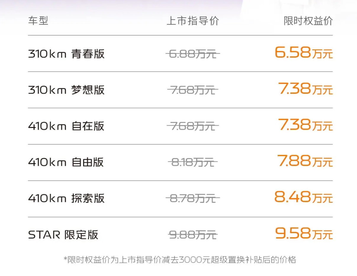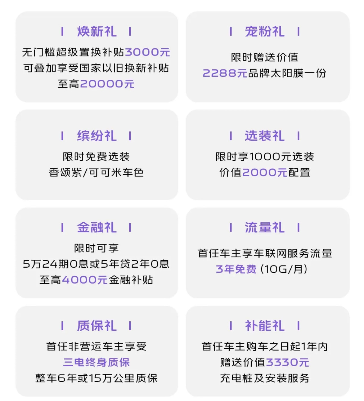 先看一下整体的上市权益,3000元的无门槛补贴,补贴后,也就是后面这个限时权益价,6.58万起。然后赠送太阳膜,送充电桩,新增的两个颜色,香颂紫和可可米,年前可以免费选。然后2026款 410km 自由版,可以限时1000元,把塑料轮毂换成铝合金的。2026款 410km 探索版,可以限时1000元,选装黑色悬浮车顶。其它的权益,就相对常规了,大家自行看图就行。
