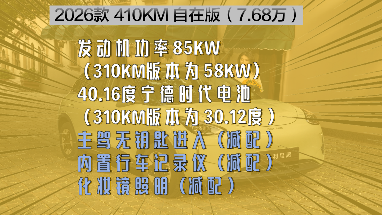 如果你说300km+的续航完全不够,那么7.68万,现在还有一个新选择,那就是2026款 410km 自在版。相对短续航版,它的电机功率升级达到了85kW,然后电池容量从30多度升级至40.16度,续航对应的提升了100km。不过它的配置,比入门的2026款 310km 梦想版还要低,少了无钥匙进入,内置行车记录仪和化妆镜照明。基本上配置和2025款的梦想版,保持一个水平。所以同样的价格,要续航还是要配置,你需要做出一个取舍。