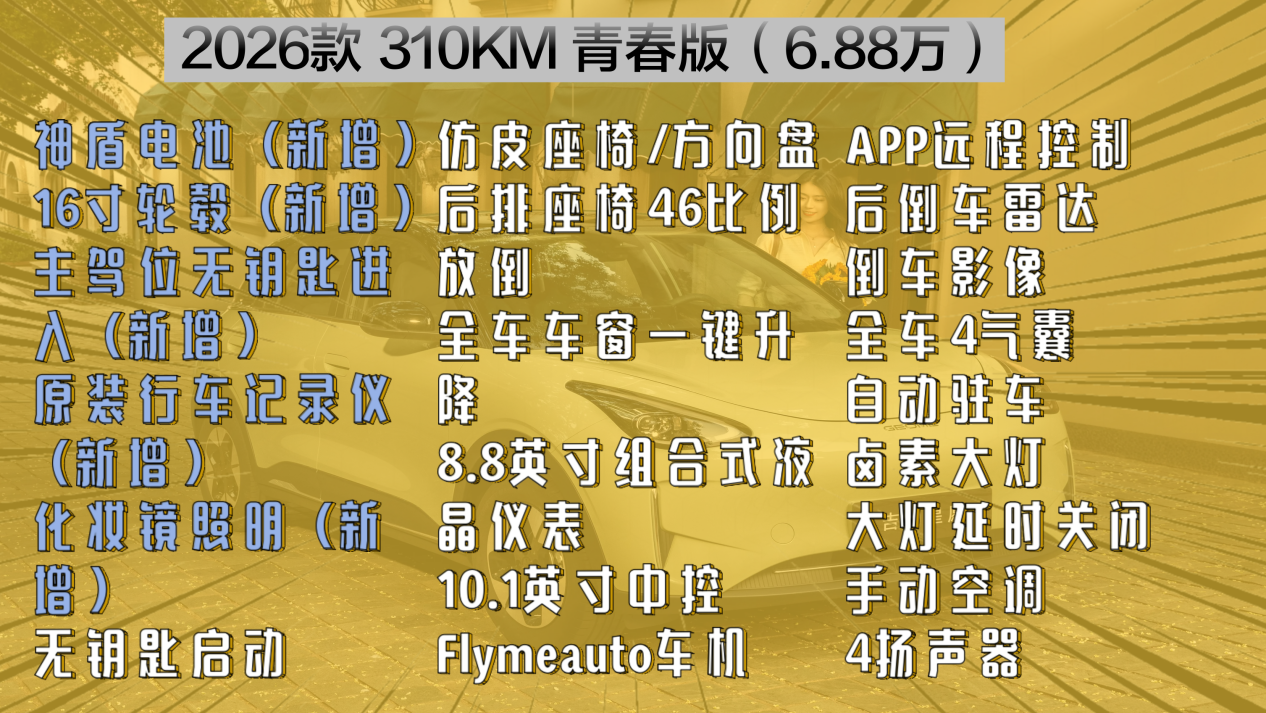 那么,具体新款哪一个配置值得优先考虑呢?咱一个一个来看,先看2026款 310km 青春版,相对之前的2025款车型,15寸小轮毂换成了16寸,主驾驶位有了无钥匙进入功能,还多了原厂的行车记录仪和化妆镜照明灯。其他的功能配置,与老款保持一致,大家自行看图就行。虽然都是小打小闹的提升,但是大一号的轮毂和无钥匙进入,感知效果还是比较强的,加量不加价,没啥好吐槽的。