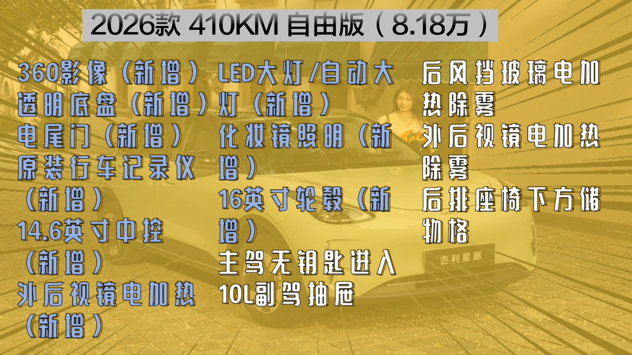 当然,你也可以选择,再加5000元,入手2026款 410km 自由版。它相对2025款的自由版,又新增了14.6英寸中控,外后视镜电加热,LED大灯等功能,当然中低配新增的那些东西,像是360影像,电尾门等功能,也是有的。其他的配置,和2025款保持不变。5000元的差价,我想大部分人还是可以接受的。而且这个版本,要续航有续航,要配置有配置,相对来说,没有那么多的遗憾,应该会成为主流消费者的主流选择。