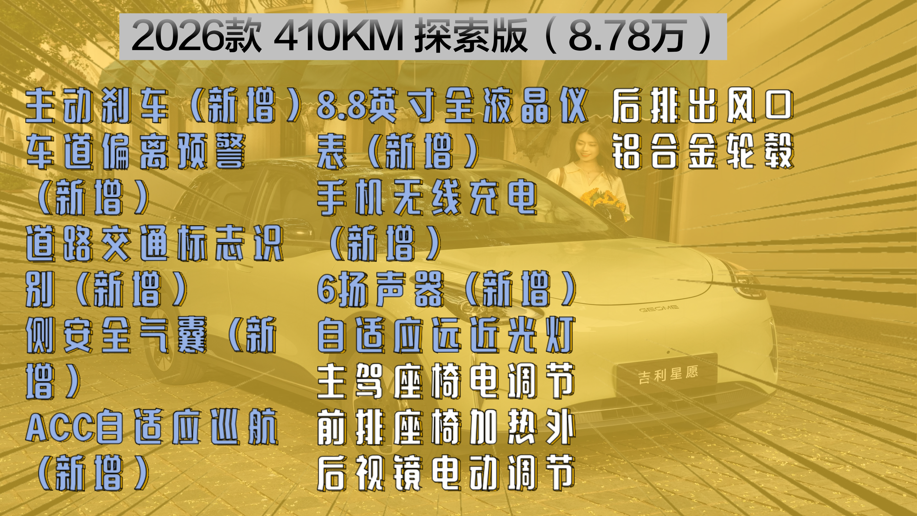 再往上还有两个版本,2026款 410km 自由版+6000元,可以买到2026款 410km 探索版,相对于2025款的探索版,新款主要是增加了一系列安全配置,像是主动刹车、ACC自适应巡航、自适应远近光灯、侧安全气囊,不过遗憾的是,边边角角的主动安全配置给了很多,但组成L2的核心功能 车道居中保持,却没有配备,所以有点鸡肋。除此之外2026款 410km 探索版,还新增了8.8英寸全液晶仪表,手机无线充电等功能。性能上继续锦上添花,但是8万大几的售价,落地9万多,这个价位再买星愿这种小车,多少有点说不过去了。现在比亚迪秦L EV、零跑B01等很多正经三厢车,9万多都能买到了。