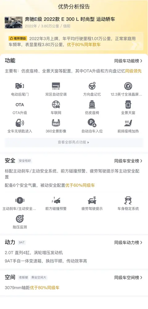 这辆二手奔驰E级 2022款 E 300 L 时尚型 运动轿车在市场中展现出鲜明的竞争力,特别是在安全配置方面,它超越了82%的同级车型,彰显出更高的安全标准。此外,车辆的保值率也高于同级车,这意味着在未来的二手车市场上,它能够更好地保留价值。然而,从缺点来看,该车的后排空间相对较局促,可能不太适合长时间乘坐,这对于经常有后排乘客的用户来说,是一个需要考虑的因素。另外,频繁的过户记录也可能影响车辆的稳定性和保养情况,这是潜在买家在做出购买决策前应仔细评估的另一个方面。