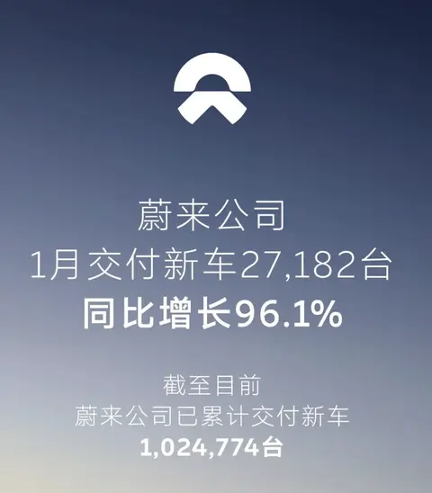 蔚来1月交付27182台,同比增长96.1%,环比下降43.5%。其中,全新ES8交付开启134天完成第60,000辆交付。