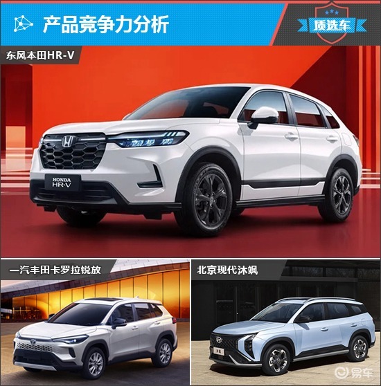 纵观国内合资紧凑型SUV市场,与2026款东风本田HR-V(以下简称:本田HR-V)定位相近且价格相当的车型并不多,综合考虑销量、口碑和品牌形象等多方面因素,此次与本田HR-V进行对比的车型是2026款一汽丰田卡罗拉锐放(以下简称:丰田卡罗拉锐放)和2026款北京现代沐飒(以下简称:现代沐飒)。