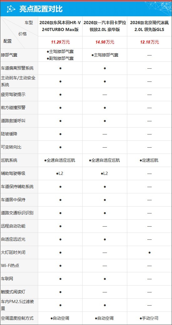 配置方面,本田HR-V整体表现更为全面,在安全、驾驶操控等方面具有一定优势,独享副驾膝部气囊、疲劳驾驶提示等多项功能。相比之下,现代沐飒在驾驶功能和主动安全配置方面存在明显缺失,与另外两款车型有不小差距。