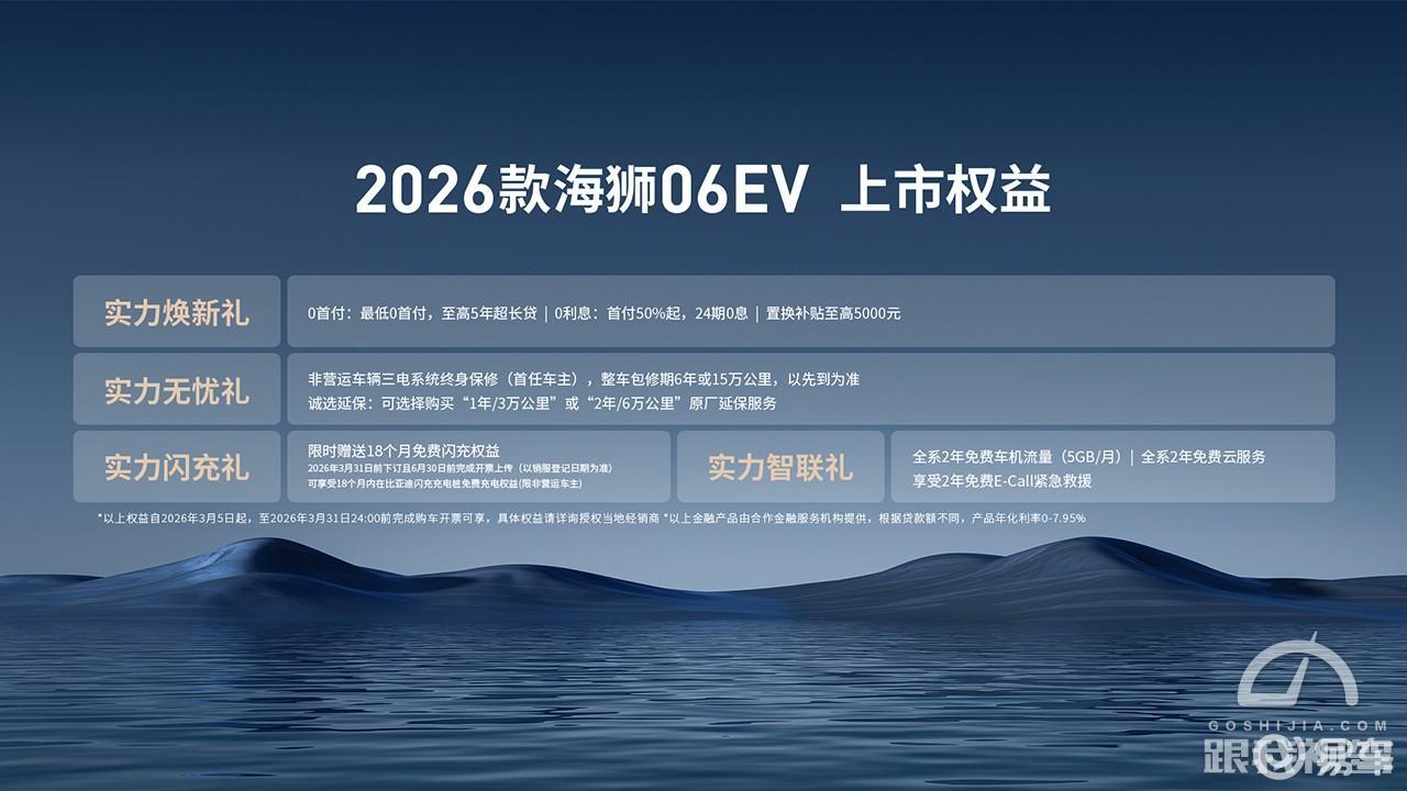 3月5日,在比亚迪第二代刀片电池和闪充技术的发布会上,2026款比亚迪海狮06EV也官宣上市,此次上市的车型共分为4款,纯电续航分别为605公里和710公里,官方售价区间为15.99万元~17.99万元,成为海洋网首搭第二代刀片电池和闪充技术的suv车型。当然除了公布正式售价之外,2026款海狮06EV也给出了不错的上市权益,包括置换补贴至高5000元、限时赠送18个月免费闪充权益,以及首任非营运车辆三电系统终身保修等等。