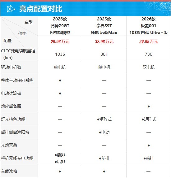 具体到车辆配置层面,通过对比来看,腾势Z9GT不仅CLTC纯电续航里程最长,而且配置上独享整体主动转向系统、电动扰流板、后排手机无线充电功能,综合表现要好于其他两款车型。享界S9T和极氪001则各有自身优势,前者独享电动后排侧窗遮阳帘;后者采用双电机驱动,并且配置上独享感应后备厢和光感天幕。