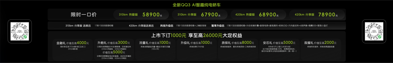 与瑞虎7L同台亮相的,还有一代“国民神车”全新QQ3。新车此前已斩获盲订超6万台、预售超4万台的傲人战绩,此次区域上市备受瞩目。全新QQ3推出310km、420km两种续航版本共四款车型,官方上市价5.89万元起。上市期间下订1000元可享至高26000元大定权益,涵盖金融礼(限时享至高7万36期0息(贷款五年前三年还款可免息);5万24期0息)、升舱礼(热爱版免费赠送540全景影像及后视镜加热,分享版赠送电动前备箱及自动泊车辅助)、流量礼(终身免费基础流量加赠2年娱乐流量)、升级礼(终身免费ota升级)、质保礼(整车及三电终身质保)、安芯礼(动力电池衰减超过30%可免费更换电池,首任非营运车主电池自燃赔新车)及救援礼(终身免费道路救援)。