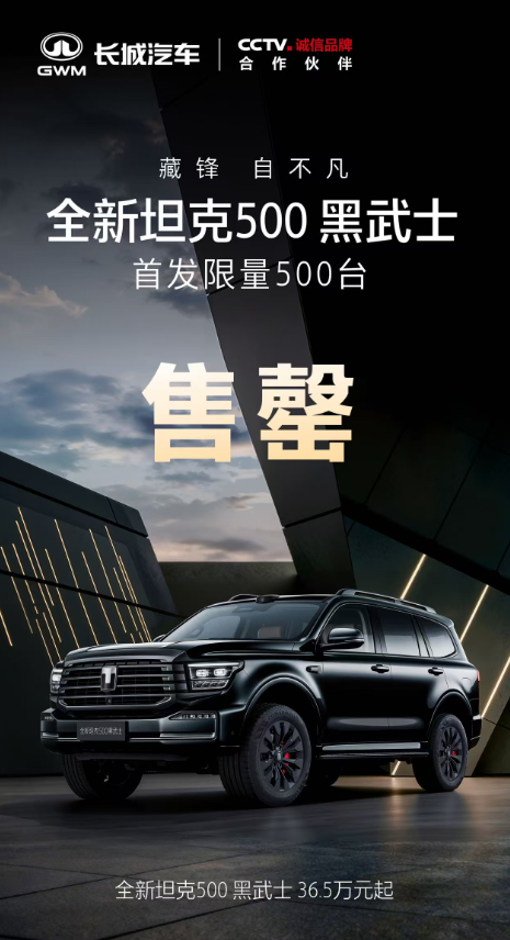 坦克500黑武士并非首次亮相,早在2021年3月坦克500首发上市时,便同步推出了3.0T黑武士版,创下了限量500台2分钟抢订一空的荣耀战绩,形成了独树一帜的硬派越野爆款黑武士IP。2024年10月又进一步推出Hi4-T黑武士版,持续满足用户对车型个性化与新鲜感的需求。而全新坦克500黑武士作为该高端定制官改IP的延续,以全维硬核实力与全黑格调,再度夯实独属于硬派越野的黑武士标杆地位。截止发稿,全新坦克500黑武士首批限量500台已售罄。