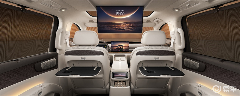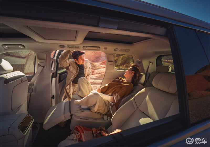 整车尺寸未公布,但得房率高达88%。六座版2+2+2布局,195mm同级最宽纯平通道;七座版支持多模式一键成床。座椅12层结构,全车电动调节,6座加热、4座通风+10点按摩,二排右侧零重力座椅(120°+4向腿托),三排131°无极调节+加热+电动翻折。全球首发车规级森野氧舱,制氧流量8L/min(弥散+鼻吸),缓解疲劳与高反。此外,8.1L冷暖冰箱(-6℃~50℃)、23扬杜比音响(2304W)、1600万色氛围灯等一应俱全。纯电版配备176L电动前备舱(带220V电源、可冲洗),后备箱最大2667L,全车至高50处储物空间。