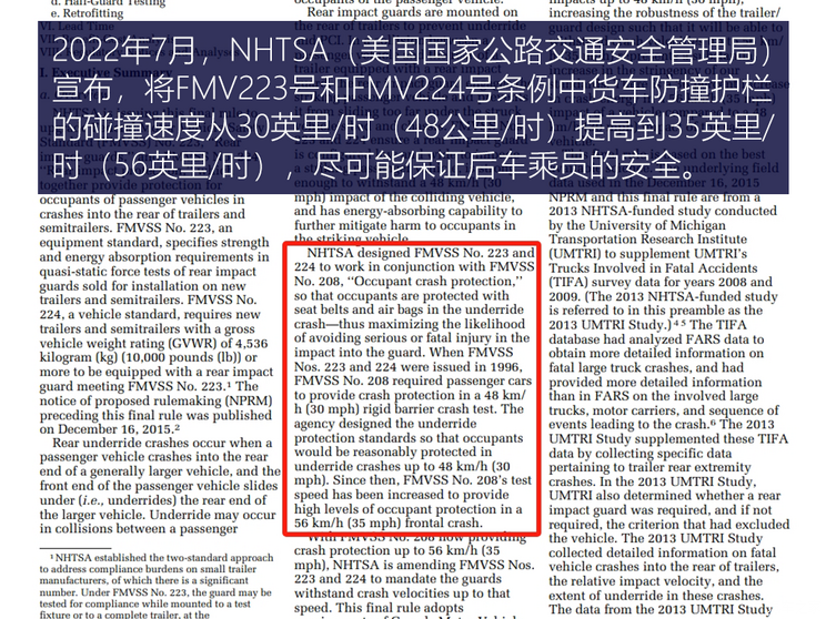 2022年7月,NHTSA(美国国家公路交通安全管理局)宣布,将FMV223号和FMV224号条例中货车防撞护栏的碰撞速度从30英里/时(48公里/时)提高到35英里/时(56英里/时),尽可能保证后车乘员的安全。美国是较早强制规定货车防撞护栏的国家,但每年仍有多起追尾货车的事故造成人员伤亡,一步步加强防撞护栏,提高碰撞速度标准,能够有效降低事故中的伤亡概率。