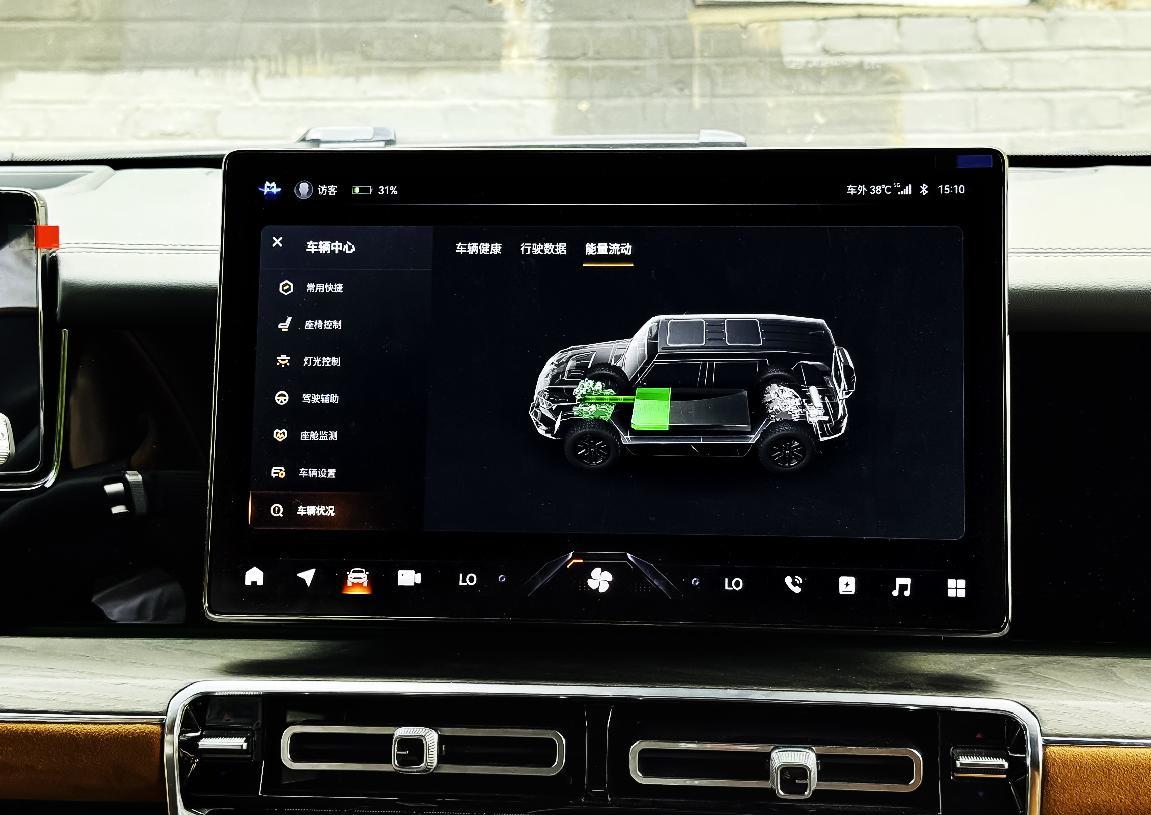 作为越野车,最吸引我的要数中控台设计了。猛士917采用了源自于飞机推力手柄的设计灵感,将变速器挡把、底盘升降和越野模式整合,每一次的操作过程,都可以感受到打孔真皮的细腻触感,与翻转式挡位显示的机械质感,这难得的体验感绝对令人上瘾。