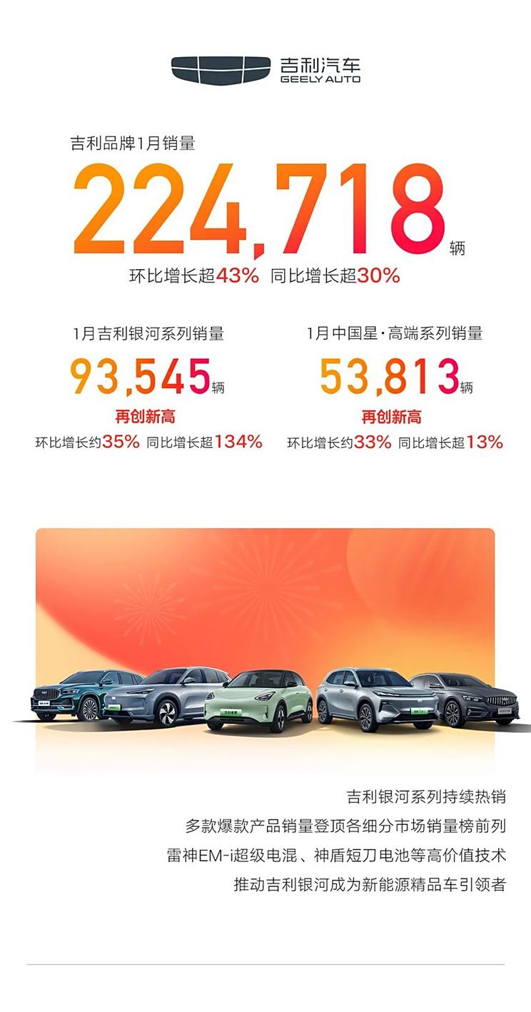 具体到品牌,吉利品牌1月销量为224718辆,其中吉利银河销量为93545辆,环比增长约35%,同比增长超134%。1月中国星・高端系列销量为53813辆,环比增长约33%,同比增长超13%。