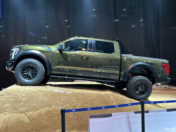 新款福特F-150猛禽此次在2025上海车展上进行中国首发,新车主要在外观和配置方面做了调整。外观方面采用了赛事同款设计,分体式日间行车灯,宽体视觉更激进。更应用了枭勇绿车漆,有一种穿越丛林的感觉。车身侧面,黑化轮毂更具气场。