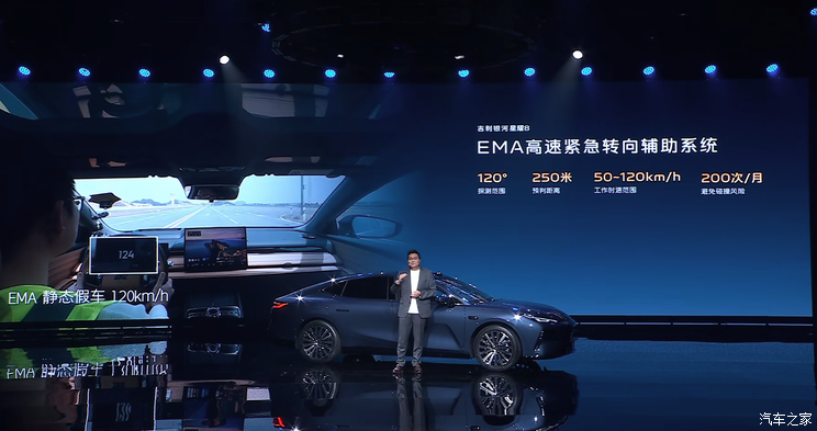 在安全辅助系统方面,新车配备AEB自动紧急刹车系统,可实现200+m超远距离感知物体,最高车速90km/h刹停。此外,新车配备EMA高速紧急转向辅助系统,可以填补高速行驶的特定场景下紧急制动功能无法发挥作用的安全空白,工作车速范围为50~120km/h。