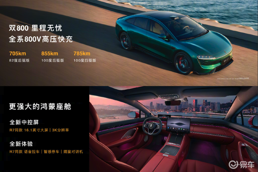 全系基于 800V 高压平台打造,单电机版最大功率 215 千瓦,0-100km/h 加速 5.4 秒,双电机版最大功率 365 千瓦,0-100km/h 加速 3.3 秒;CLTC纯电续航里程分别为705km、855km、785km ;其他还有鸿蒙座舱也做了升级。