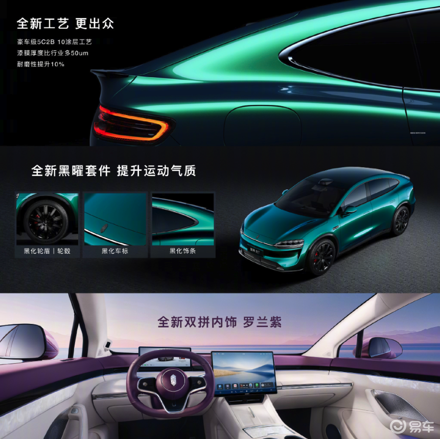 还首发极光绿配色,车内引入了全新罗兰紫内饰,配备 16.1 英寸 3K 分辨率中控屏,显示面积提升 12.9% ,清晰度提升 50% 。