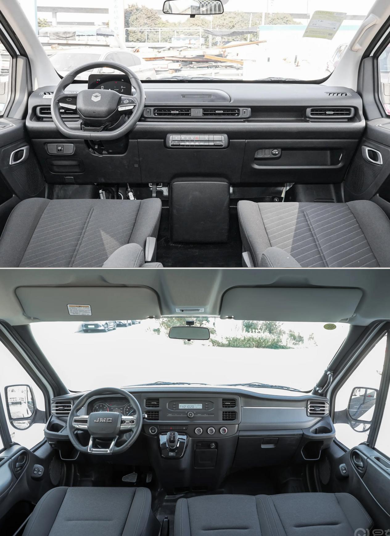 长安凯程V919的内饰采用了极简布局,中控台整体采用分层式设计,细节之处还采用哑光金属饰条修饰,车内的质感以及档次一下就得到了有效的提升。同时,中控的扁平化造型还在一定程度上扩展了视野,增强了行车的安全性。江铃福顺的内饰设计就较为传统了,布局以实用为主,中控台设计较为简洁,各功能区域划分明确,不过在设计感的营造上,与长安凯程V919相比略显逊色。