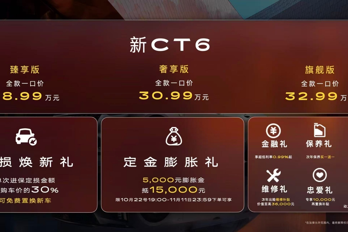 百年积淀,阅尽千帆,凯迪拉克的豪华初心始终如一。新CT6携百万级傲人气场、百万级精奢用料,百万级磁浮底盘以及百万级安全标准,树立豪华旗舰的全新标杆。即日起,用户可前往当地经销商或者登录凯迪拉克官方App、小程序以及抖音“凯迪拉克尊选”直播间下订新CT6,即刻开启执掌人生的新征程。